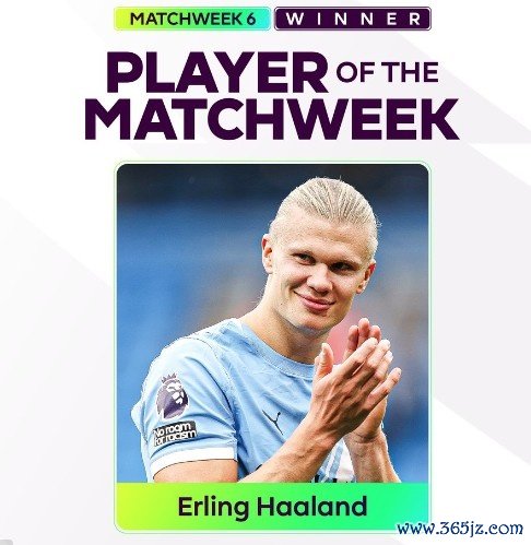10月1日讯 英超官方公布联赛第六轮最好球员,曼城中锋哈兰德当选。