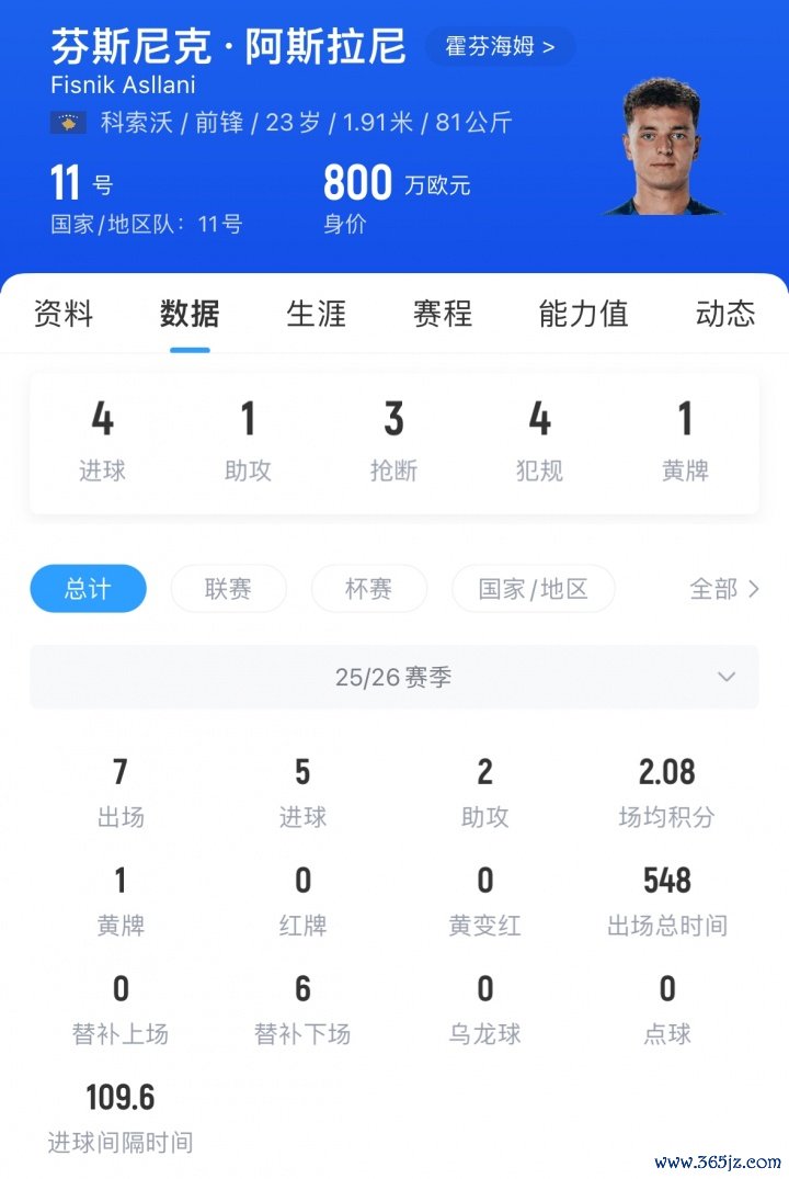 阿斯拉尼现年23岁,身高1.91米,他本赛季出场7次,孝敬5球2助,现身价800万欧,他与霍芬海姆的左券将在2029年到期。