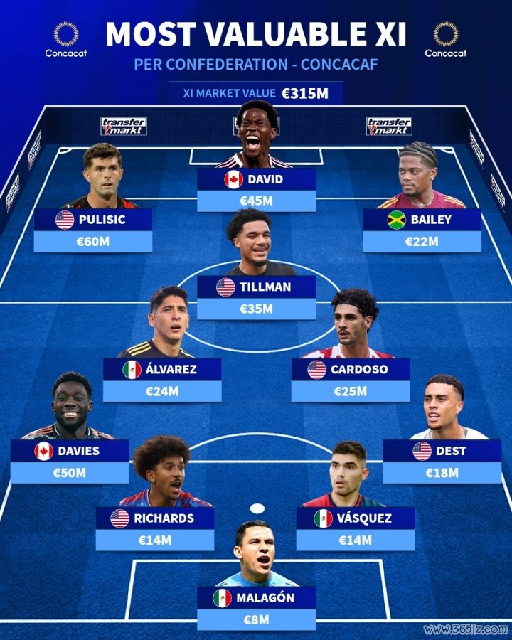 总身价3.15亿!中北好意思最贵阵:普利西奇领衔 戴维斯在列,好意思国5东谈主