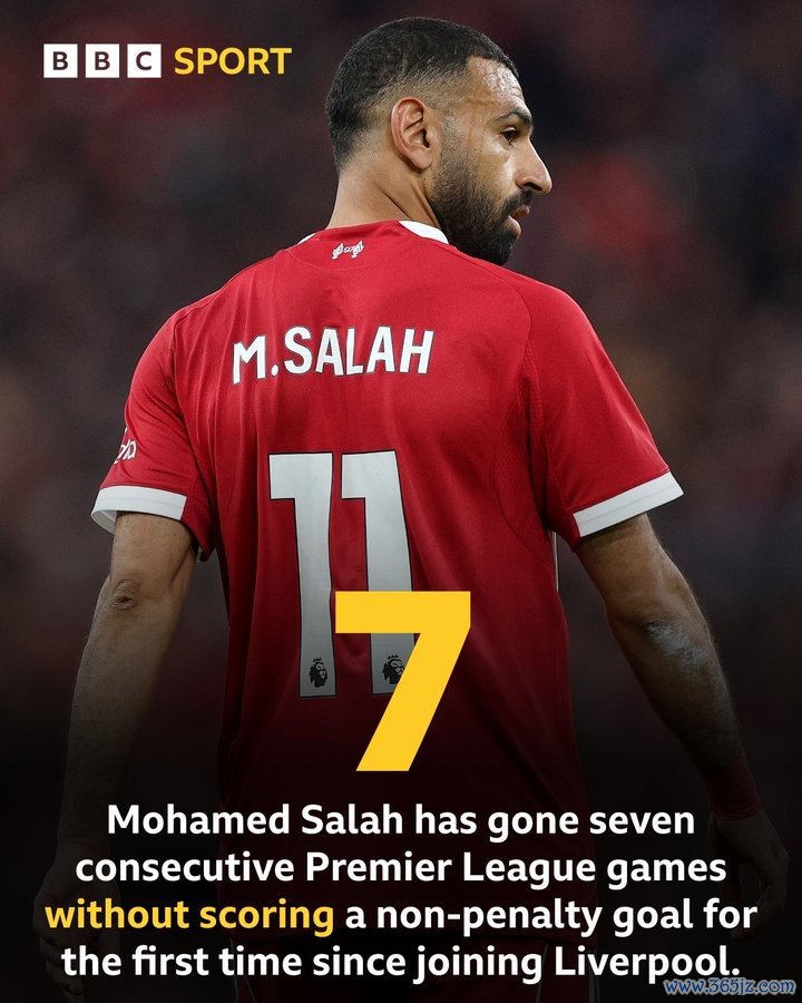 真老了?萨拉赫联络7场英超莫得非点球进球,加盟利物浦以来初度