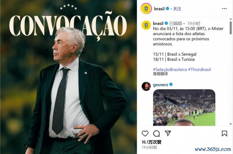 10月23日讯 据巴西国度队社媒账号发布的音尘,该队下一期的集训名单将于11月3日公布,下个月海外比赛日巴西将与塞内加尔、突尼斯两队踢友谊赛,为来岁全国杯热身并进一步检察球员。