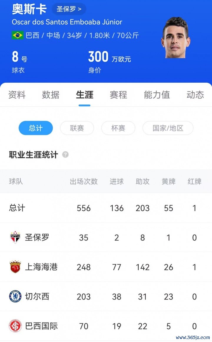 34岁的奥斯卡工作生活曾遵守巴西外洋、切尔西、上海海港、圣保罗,上赛季中超抵制后他目田身回到巴西,加盟圣保罗。