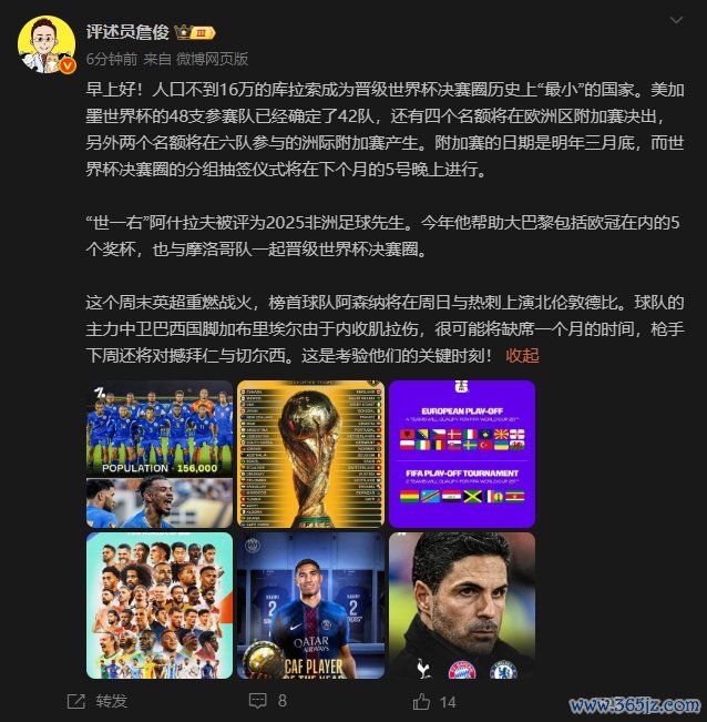 11月20日讯 知名筹商员詹俊在个东谈主微博上进行了更新,对曩昔几天足坛发生的大事进行了转头。