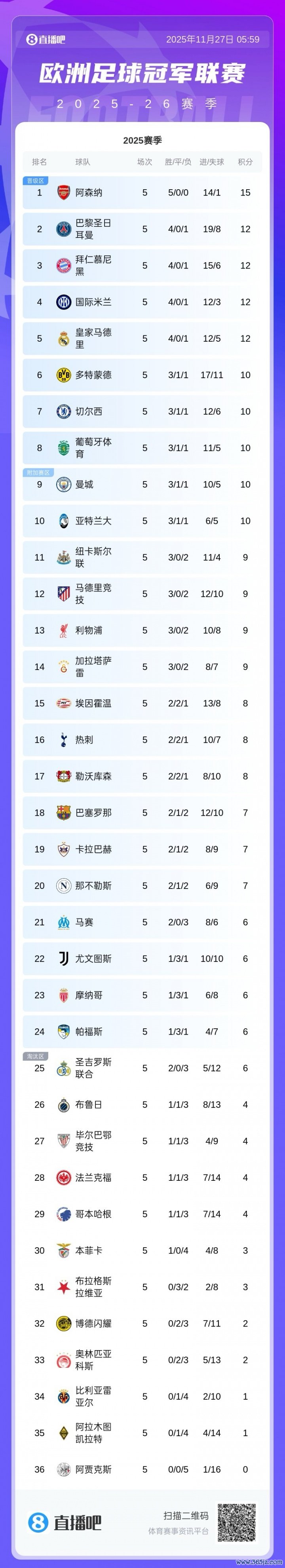 11月27日讯 欧冠联赛阶段第5轮比赛收尾,皇马取胜升至第五。