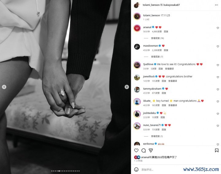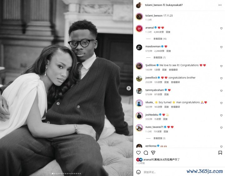 11月29日讯 一小时前,阿森纳边锋萨卡在个东说念主社媒上晒出了一组口舌滤镜的像片动态,书记了我方与女友托拉米订婚到手的捷报。