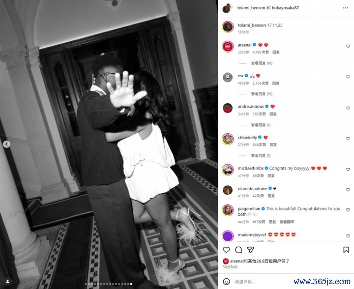 《太阳报》对此报说念称,萨卡在伦敦一家顶级酒店的夸耀聚合中与女友完成了订婚,而萨卡的动态配文“17.11.25”恰是求婚的日历。二东说念主从2020年运转交游,于今已有5年。