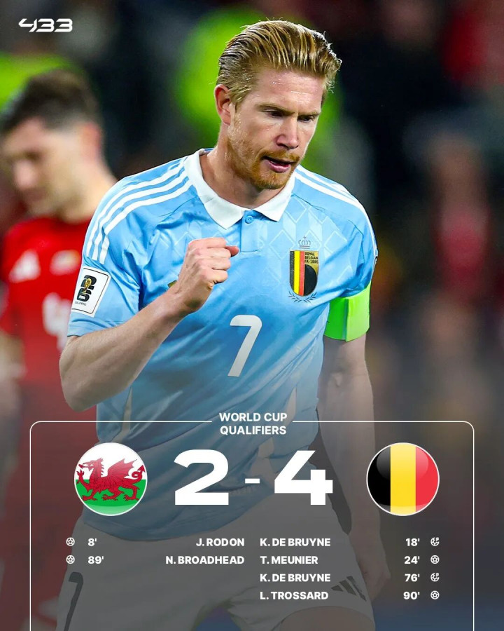罗登为威尔士先拔头筹,德布劳内点射扳平比分,随后多库助攻穆尼耶破门。下半场,德布劳内点射破门完成梅开二度,布劳德海德为威尔士扳回一城,特罗萨德为比利时锁定胜局,最终比利时客场4-2治服威尔士。