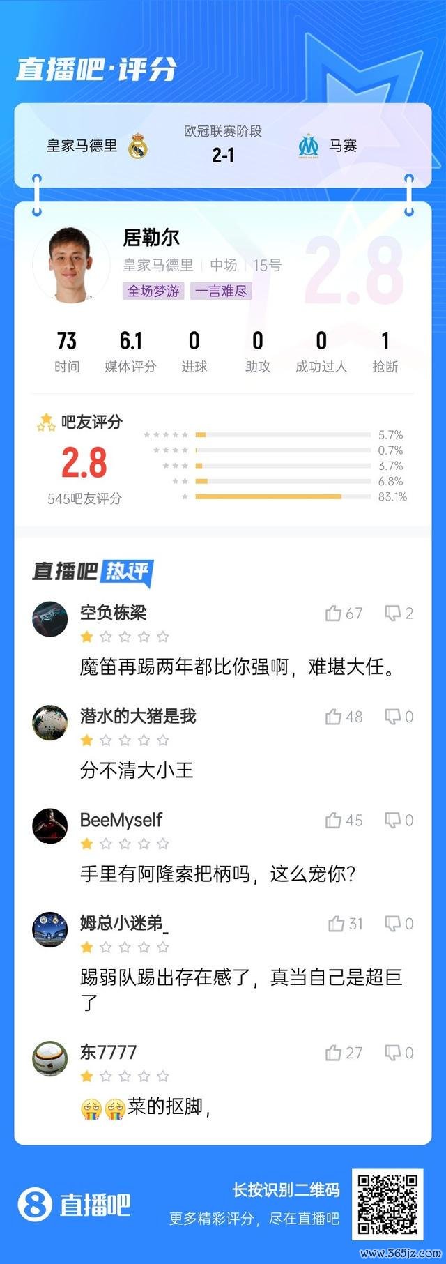 居勒尔本场比赛出战73分钟,推崇欠安,尤其一次被抢断后不积极回追以及一次浪射让稠密球迷不悦,被吧友打出2.8分的超低分。