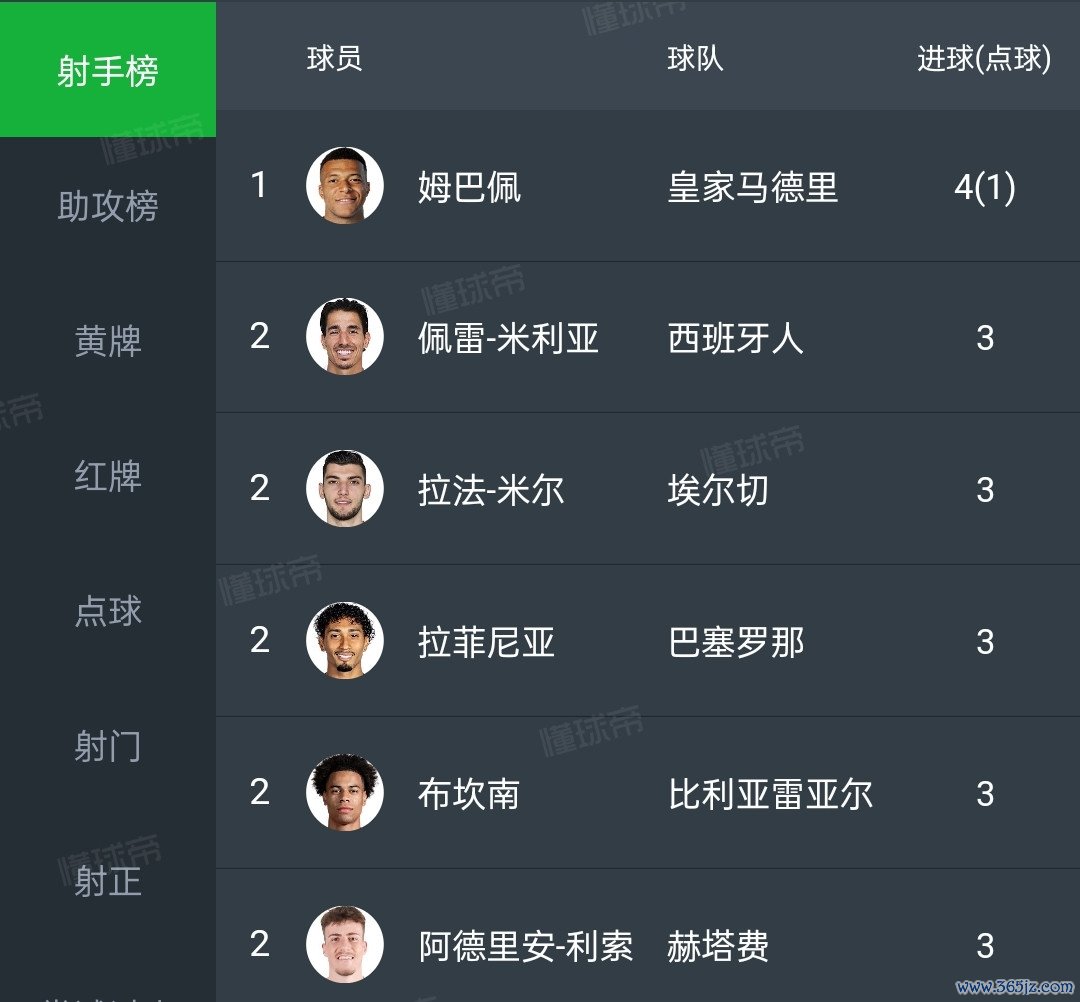 姆巴佩四球领跑,佩雷米利亚,拉法米尔,拉菲尼亚等三球紧随自后。