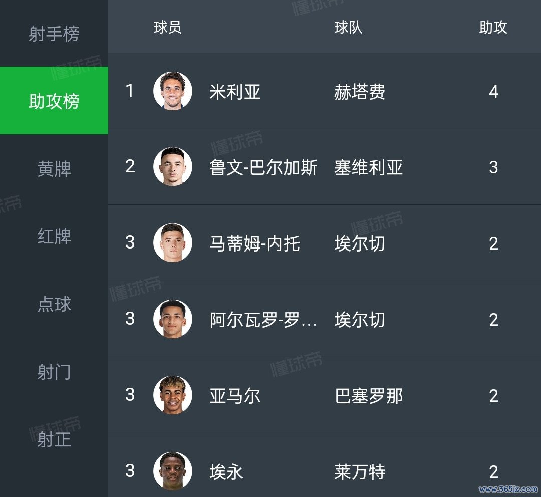 赫塔费米利亚四次助攻领跑,鲁文巴尔加斯三次助攻紧随自后。