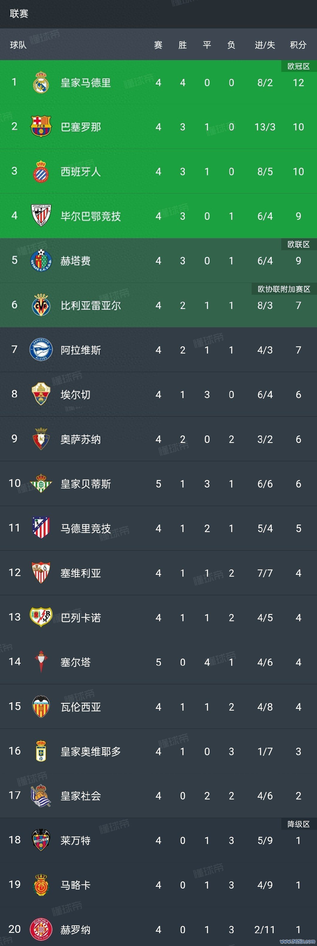 至此,西甲联赛第四轮沿途限制,西甲最新积分榜如下: