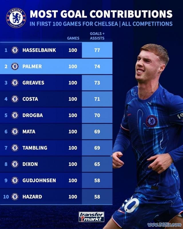 直播吧9月18日讯 德转晒出切尔西球员百场参与进球数据,帕尔默100场造74球,名次对视第二。