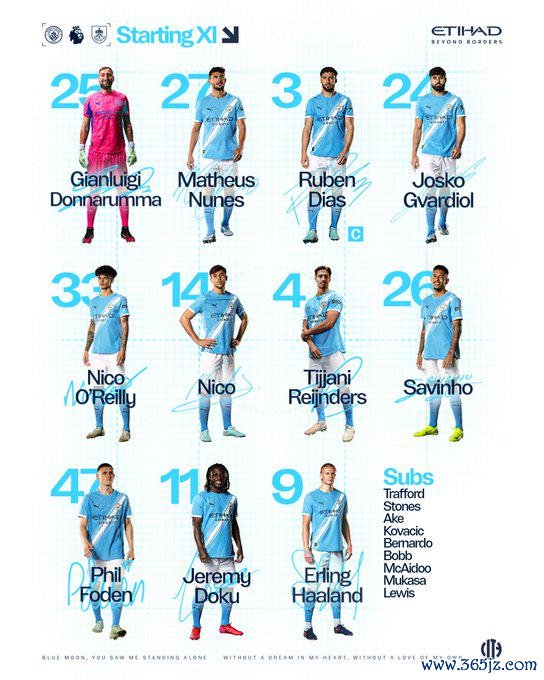 曼城首发:25-多纳鲁马、27-努内斯、3-鲁本-迪亚斯、24-格瓦迪奥尔、33-奥赖利、14-尼科-冈萨雷斯、4-赖因德斯、26-萨维尼奥、47-福登、11-多库、9-哈兰德