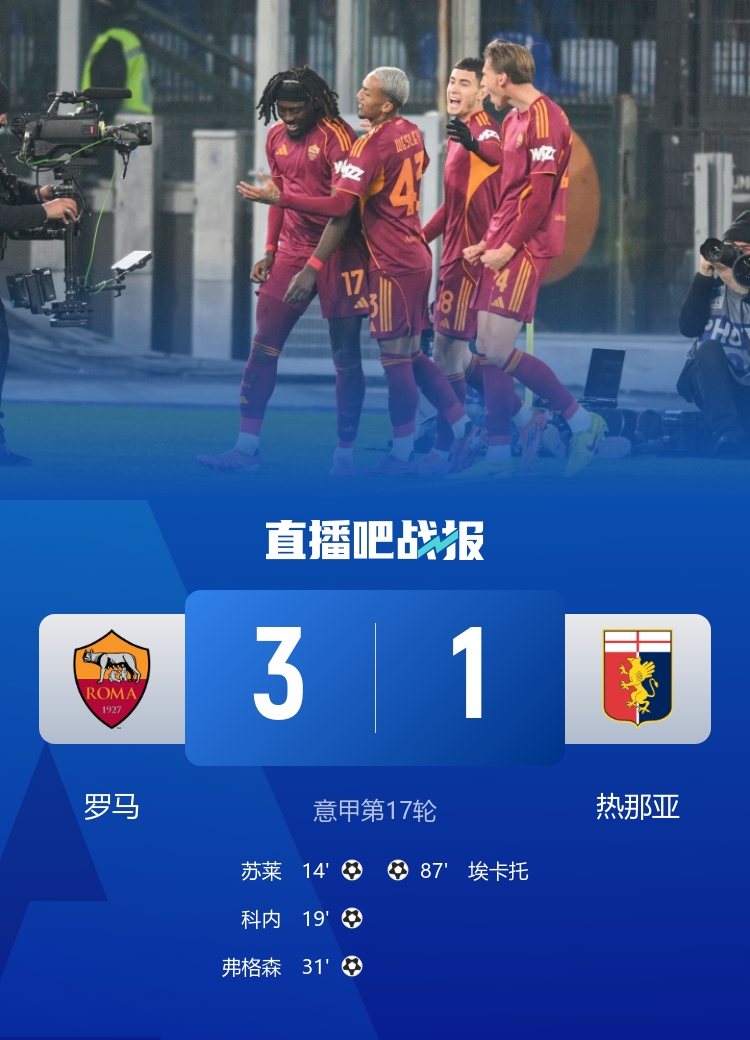 意甲第17轮,罗马3-1治服热那亚升至第四,苏莱进球。
