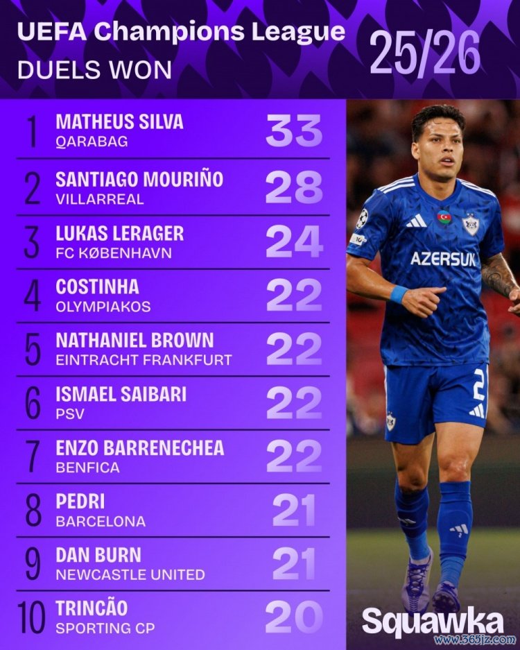 本赛季欧冠得回挣扎榜:马修斯-席尔瓦33递次一,佩德里21递次八