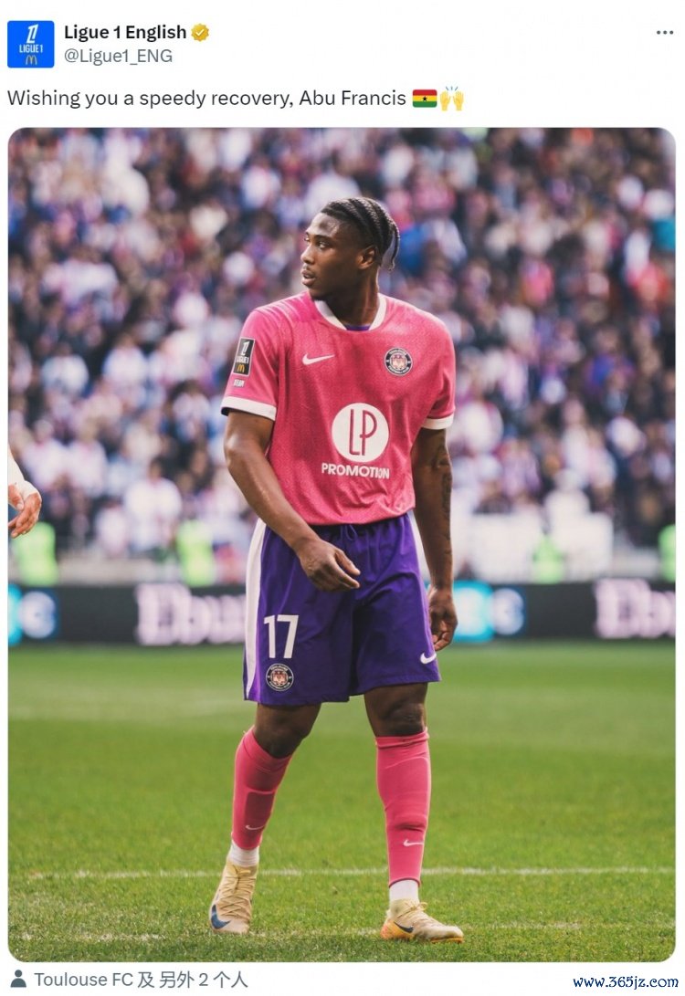 11月14日讯 法甲官方更新社媒动态,祝效能于图卢兹的加纳中场阿布·弗朗西斯早日康复。