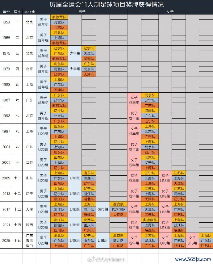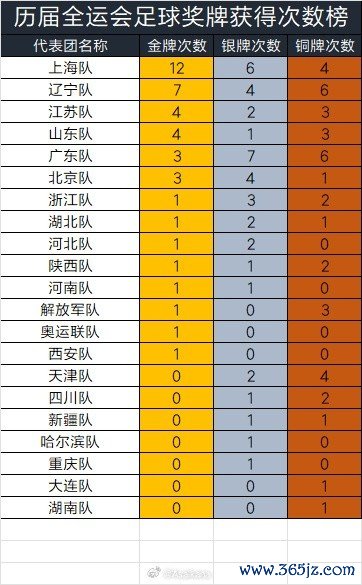 新统计了往届全运会11东说念主制足球景观奖牌获取情况和往届全运会足球奖牌获取次数榜,见表。