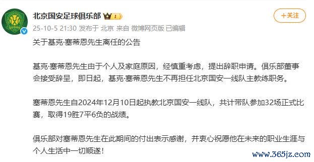 10月5日晚,北京国安俱乐部官方告示:现任主帅离任,球队暂时由助教团队负责联接。