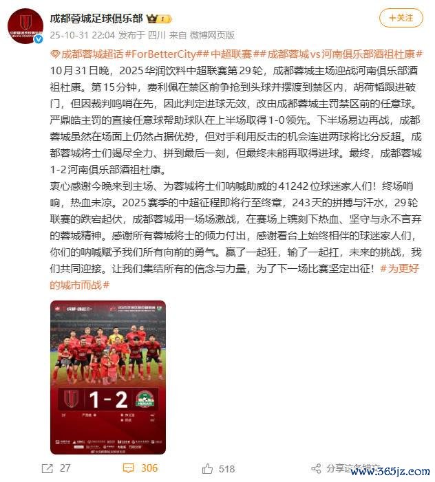 “感谢所有蓉城将士的倾力付出,感谢看台上耐久相伴的球迷家东说念主们,你们的高歌赋予咱们所有上前的勇气。赢了一齐狂,输了一齐扛,异日的挑战,咱们共同迎接。让咱们集结所有的信念与力量,为了下一场比赛坚贞出征!”